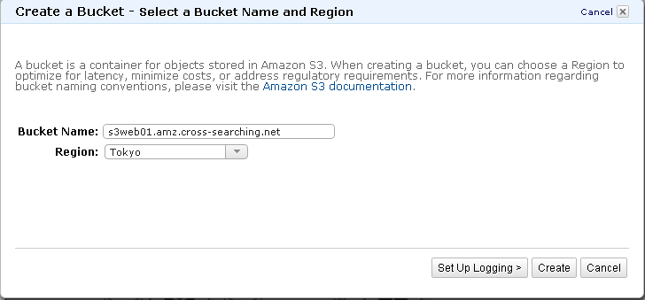 (例えば、s3web01.amz.cross-searching.netというFQDNで運用したい場合、Bucket名をs3web01.amz.cross-searching.netとする必要があります。)のでご注意ください。また、一度作成したBucketは、Bucket名を変更することができません。