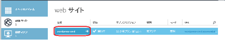 2.「Windows Azure」管理ポータルサイト -対象「WEBサイト」クリック