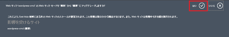 ギャラリー(Gallery)からWordPressなどを選択しWebサイトを作成した場合のデフォルトモードは、「無料」モードとなっている。 この無料モードは、転送量の制限などがあります。本番環境としては利用する場合は、他のモード(共有モード/標準モード)へ 変更するべきです。