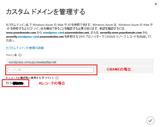 CNAME レコードを使用すると、Windows Azure Web サイトを参照するようにドメイン名を構成できます。また、A レコードを使用して、Windows Azure Web サイトを参照するようにドメイン名を構成することもできます。最終的にドメイン名を管理ポータルに設定する前に、CNAME レコードと A レコードが伝播するまで待機する必要があります。