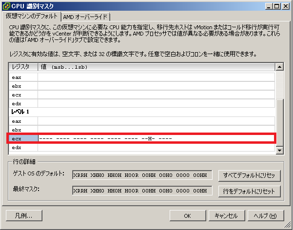 「CPU認識マスク」画面 -> レベル「ecx」 -> 下記パラメータ記入 -> 「OK」