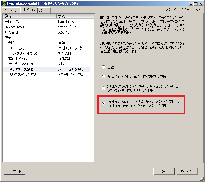 「仮想マシンのプロパティ」画面 -> 「オプション」タブ -> 「CPU/MMU仮想化」-> 下記選択 ->「OK」